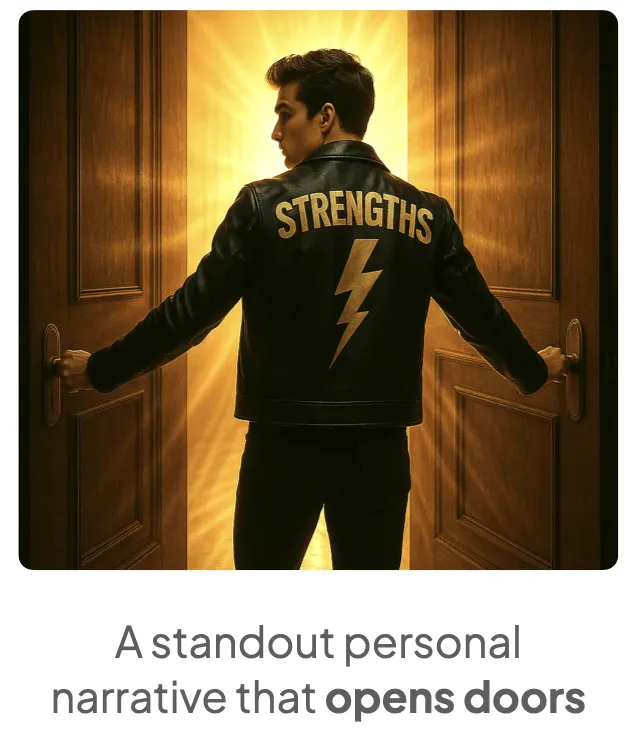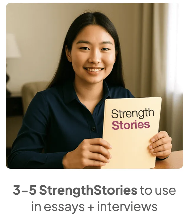 In today’s competitive landscape, high scores alone aren’t enough. Students need a clear, personal narrative that helps them stand out and be remembered. StrengthsStories give your child a way to connect the dots between their achievements, their character, and their future direction — in a way that feels authentic and compelling.