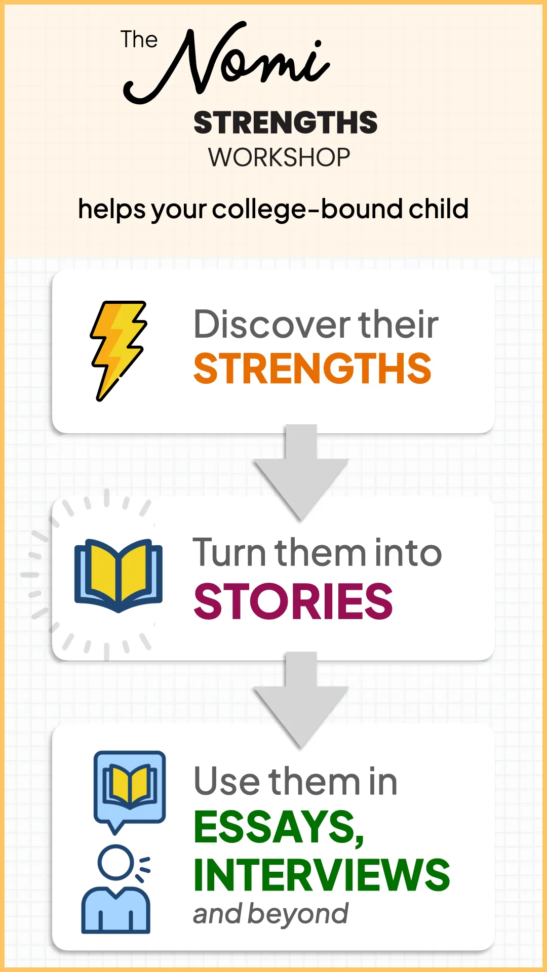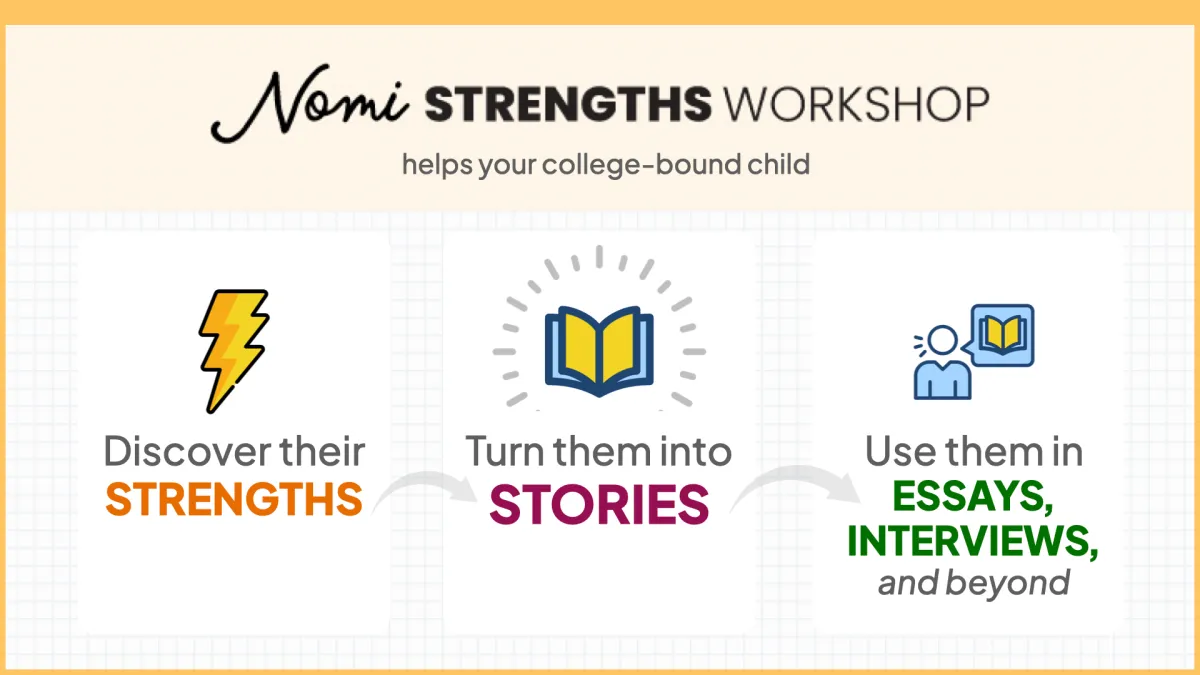Most students aren’t ready to write compelling essays until they truly understand what makes them stand out. The Nomi Strengths Workshop helps your child discover the strengths, stories, and evidence that become the foundation of strong essays and interviews.