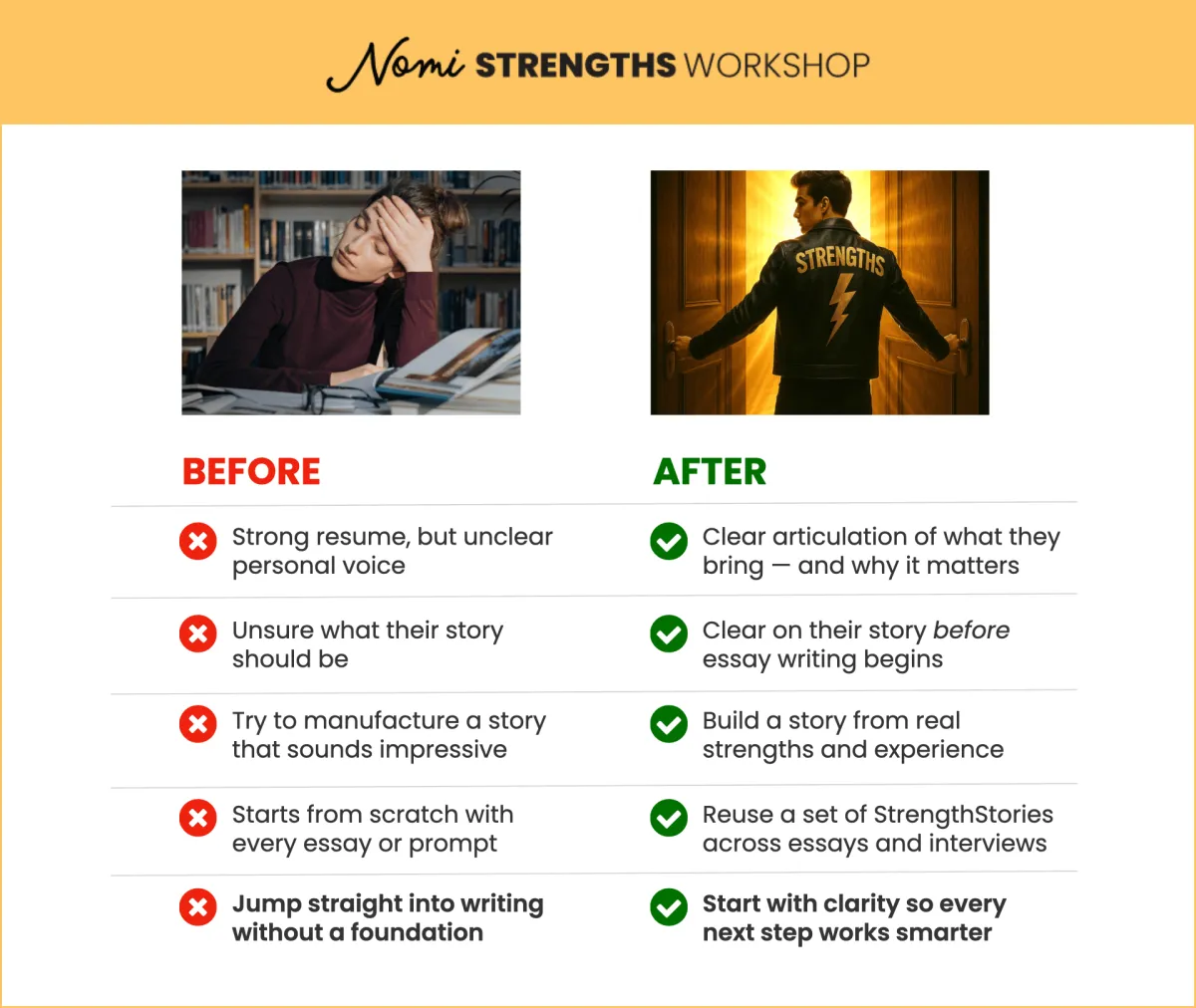Before students worry about what to say in an essay, the Nomi Strengths Workshop helps them discover who they are. Then when it’s time to write, speak, or interview, they’re not guessing or performing.