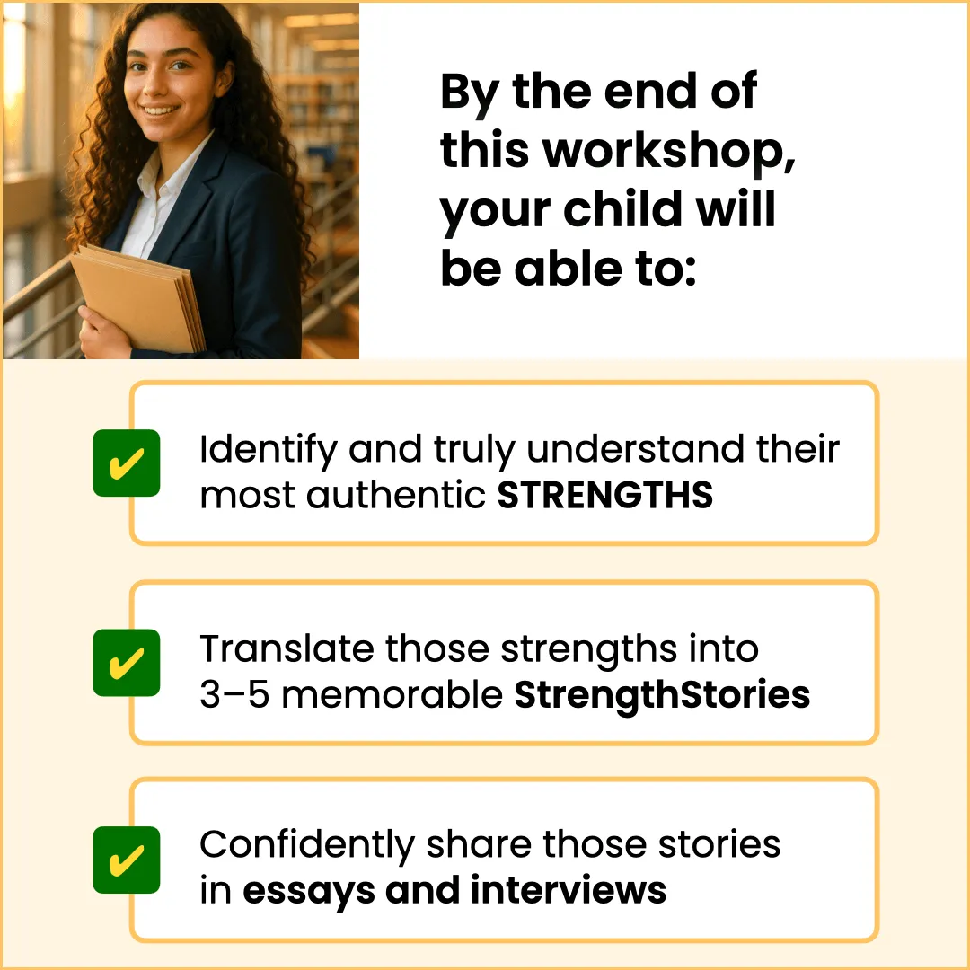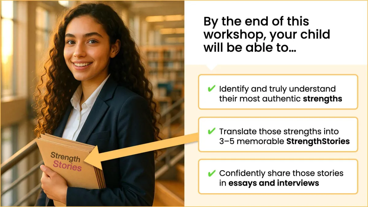 By the end of the workshop, your child will have 3–5 polished StrengthsStories they can adapt for essays, interviews, and applications. They’ll also have a deeper understanding of their own strengths—and the confidence to talk about them in a way that’s genuine and persuasive.