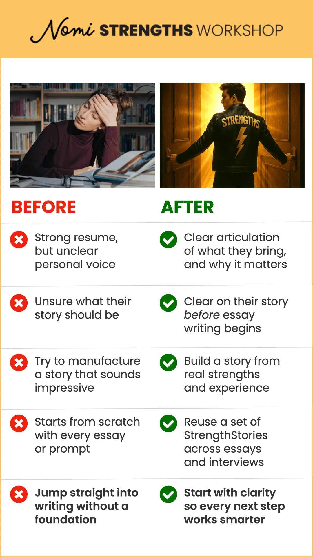 Think of it this way: if the college essay is a campfire, the Nomi Strengths Workshop is the match that ignites the flame. It gives your student clarity, confidence, and authenticity that’s ready to shine.